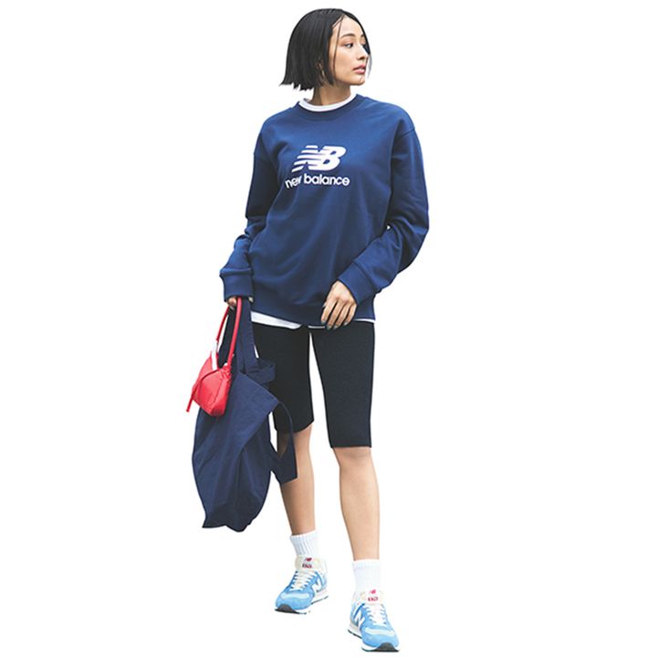スウェットトップス¥7,920、スニーカー¥11,990(ともにニューバランス/ニューバランスジャパンお客様相談室) 中に着たTシャツ※メンズ¥23,100(オールド イングランド/オールド イングランド銀座店)パンツ¥22,000(フィーニー) ピアス¥19,800(マリア ブラック/マリア ブラック 表参道店) 赤バッグ¥18,480(コキヨ/アダム エ ロペ) トートバッグ¥14,300(サンディニスタ/トゥー・ステップ) ソックス¥3,300(シー/エスストア)