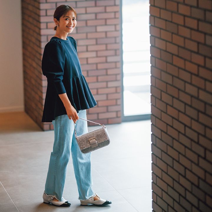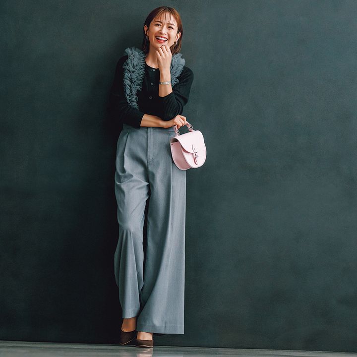 パンツ¥20,900(スリースクエア)ニット¥11,000(ノーク)バッグ¥29,700(ケンブリッジ サッチェル/エスピービー)シューズ¥18,150(ダイアナ/ダイアナ銀座本店)ピアス¥110,000(ウノアエレ/ウノアエレ ジャパン)バングル¥41,800(ハイク/ボウルズ)