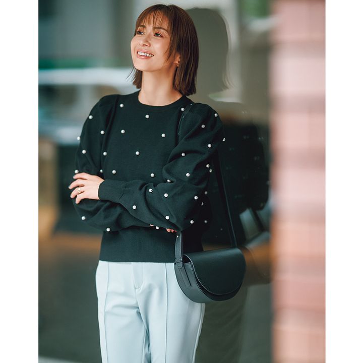 ①手持ちのパンツが見違える!華やか「パール付きニット」