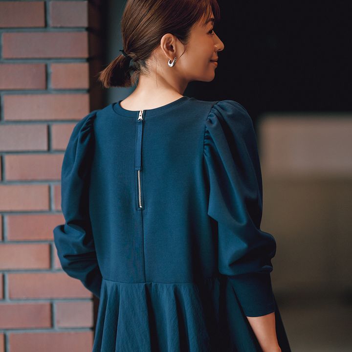 動くたびにペプラムが躍る、360度どこから見ても美しい1着。カジュアルなポンチ素材で休日やアクティブシーンでも活躍します。
