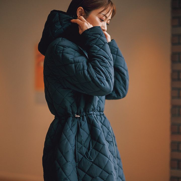カジュアルなキルティングジャケットでもロング丈で羽織るだけでサマ見え。大きめのフードが、アクティブ感を加速します。