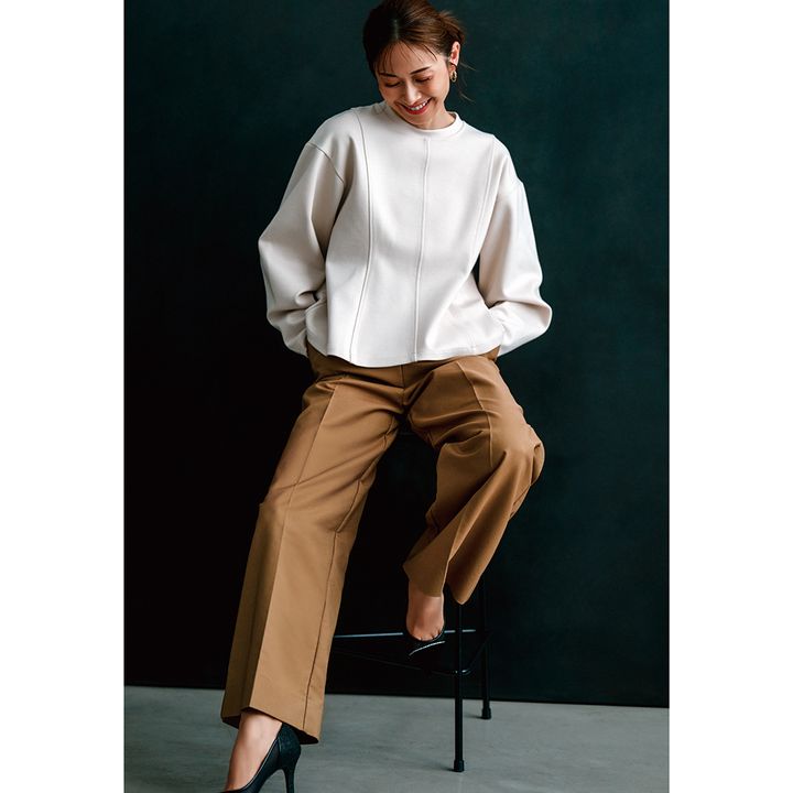 一見シンプルなトップスですが、ポイントになる切り替えと、ほんのりフレアに広がるシルエットで地味にならない。甘疲れにも有効なデザイントップスです。