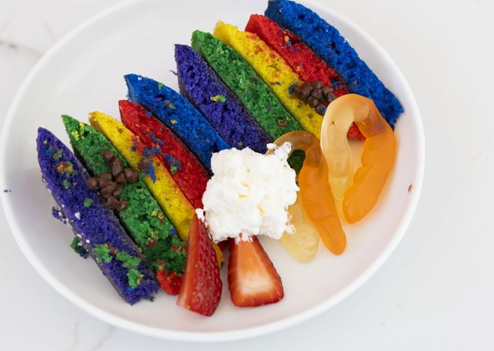見てください、このビビッドなブルー、レッド、イエロー、グリーン、パープルの断面を!写真映えするだけじゃなく、ふわふわでちゃんとおいしくいただけるのもうれしいポイントです。