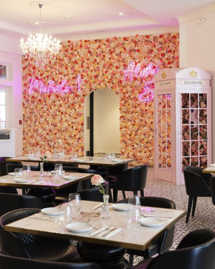 一面にシルクフラワーをあしらった壁に、ピンクのネオンサインが光るこのコーナーが店内で一番の”映えスポット”。ピンク色のテレフォンブースに入って記念撮影するお客さんが多いのだとか。