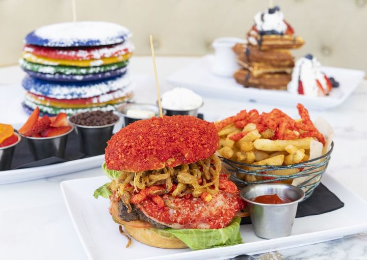 ピリ辛好きさんにおすすめなのが「フレーミングホット・チートス・バーガー」。ジューシーなビーフパテに、チートスをまぶしたジャックチーズ、ピクルス、レタス、トマト、サクサクのオニオンフライを重ねた、食べ応え満点のバーガーです。バンズやポテトにもチートスが入っているのがおもしろいですよね。