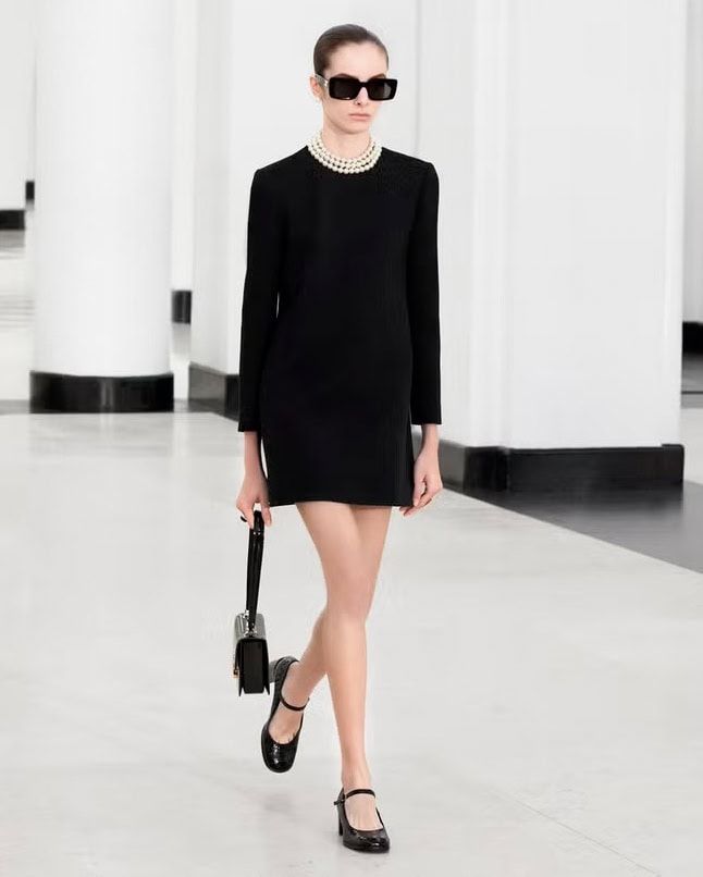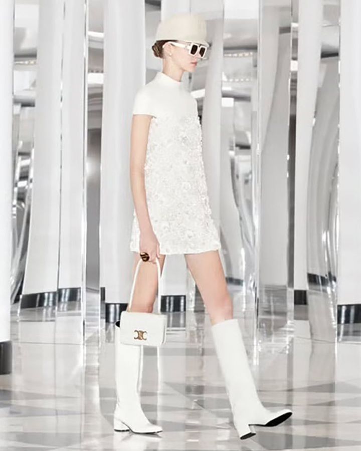 セリーヌの黄金期とされる1960年代に焦点を当てた2024ウィンターコレクションは、当時のクラシックさをモダンに再解釈。ミニ丈を基軸としたエディ・スリマンらしいキャッチーなルックの数々に、心奪われた女子は多いはず。どのスタイリングでもアクセントになっていたのは、彼が就任して以来、メゾンのエンブレムとして存在感を増すトリオンフロゴ! バッグはエレガントな「ニノ」、長いショルダーが印象的な「ギャランス」など新顔が続々登場。シューズもトウやかかとに、さり気なくトリオンフが!