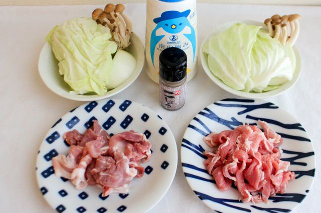 「こま切れ肉」と「バラ切り落とし肉」を、それぞれ90g用意。「野菜炒め」の具としてキャベツの葉1枚、玉ねぎ1/6個、しめじ1/6株、塩とこしょう各適量を、それぞれ用意しました。