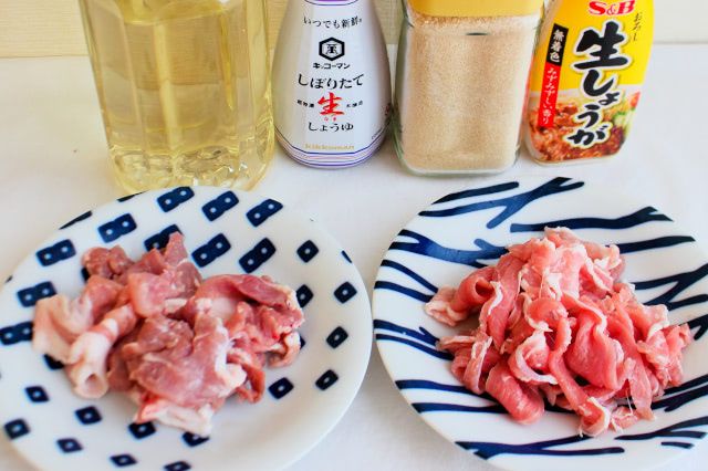 「こま切れ肉」と「バラ切り落とし肉」を、90gずつ用意。調味料は、チューブ入りしょうが小さじ1/2、みりん大さじ2、しょうゆ大さじ1、砂糖小さじ1/2、水60mlを、それぞれに用意しました。
