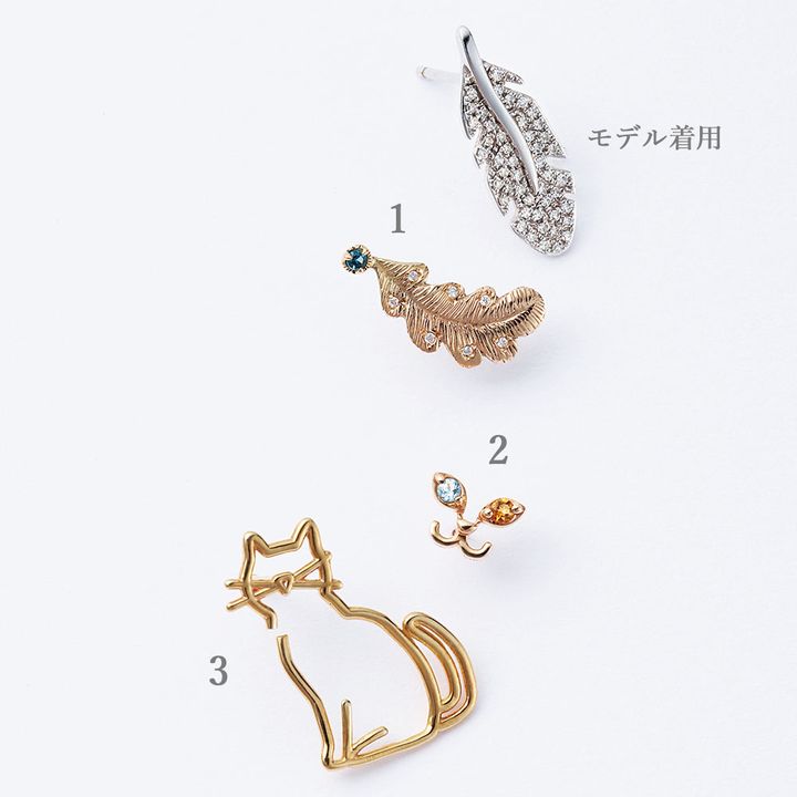 【静物】1 シングルピアス〈K10YG×ロンドンブルートパーズ ×DIA〉¥35,000(オーロラグラン/オーロラグラン 表参道ショップ)2 シングルピアス〈K10YG×左ブルートパーズ、右シトリン〉¥16,500(ヴイエー ヴァンドーム青山/ヴイエー ヴァンドーム青山 有楽町マルイ店)3 シングルイヤカフ〈K9YG〉¥49,500(アリータ/ブルーベル・ジャパン〈ファッション事業部〉)【モデルカット】シングルピアス〈K18WG×DIA〉¥132,000(ビジュードエム)トップス¥28,600(ブリル/ブリル新宿)パンツ¥28,600(ベッド&ブレックファスト/グリードインターナショナル トウキョウストア)