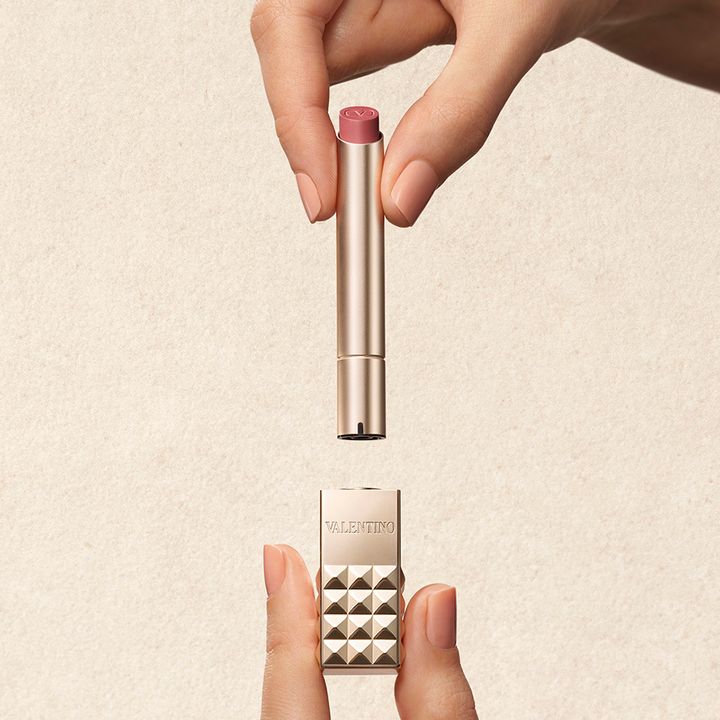 ユニークで特徴的なゴールドのリップ トップ コート(600A)を含む、ムードを上げる13色をラインナップ。サスティナビリティへの配慮の観点から、13色のうち6色はレフィルでも展開。ヴァレンティノ ビューティ推奨のステップで使用すると、より洗練された印象の唇が完成します。