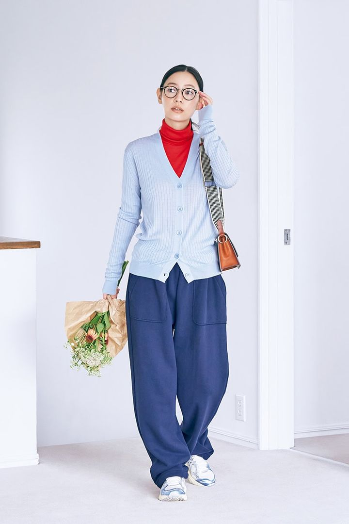 カーディガン¥55,000/ジョン スメドレー(リーミルズ エージェンシー)、タートルカットソー¥15,400/ブラームス(ワンダリズム)、スウェットパンツ¥11,000/フィデリティ(サンマリノ)、スニーカー¥19,800/アシックス(アシックスジャパン カスタマーサポート部)、バッグ¥48,400/オーマイバッグ(クオリネスト)、メガネ¥48,620/オリバーピープルズ(ルックスオティカジャパン カスタマーサービス)
