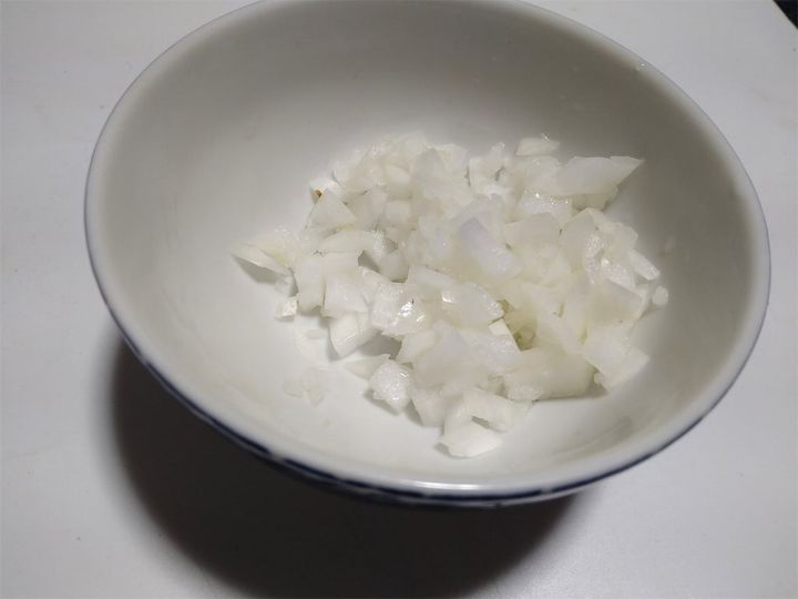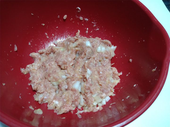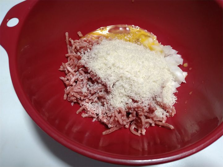 3.ボウルにひき肉、玉ねぎ、溶き卵、塩、こしょう、パン粉(大さじ2)を入れてよく混ぜ合わせる。