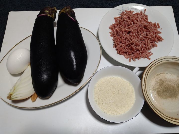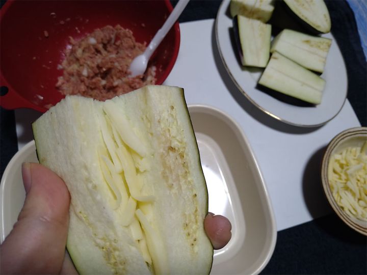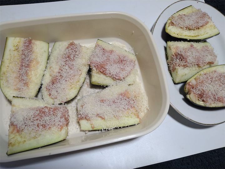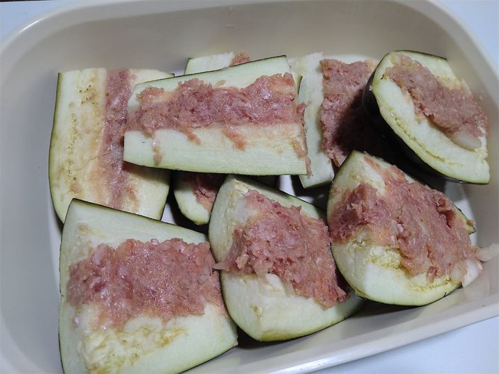 4.なすの切れ目にチーズを挟み、その上からひき肉を詰めてパン粉(適量)をまぶす。