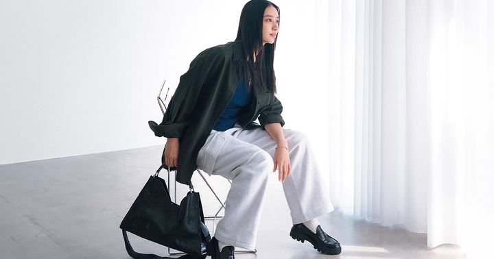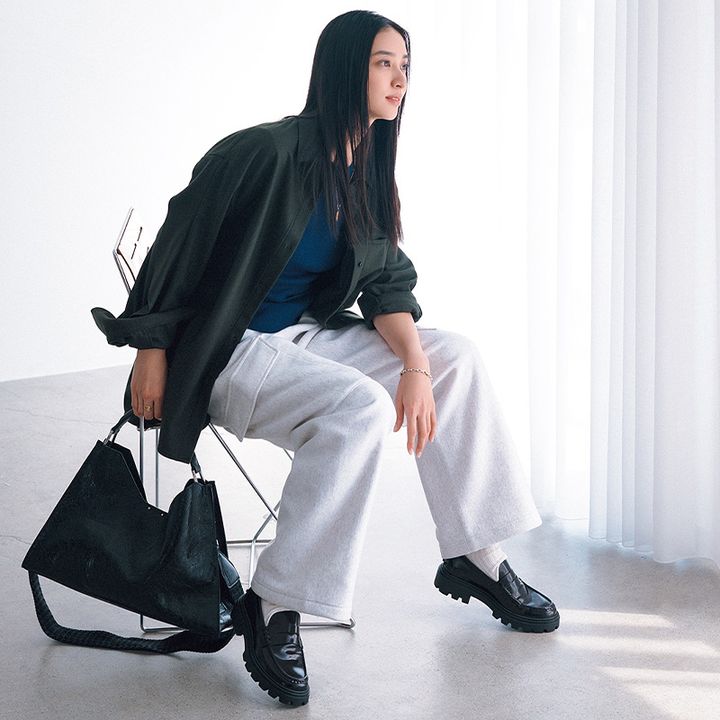 スウェットパンツ¥30,000(フィーニー)リブTシャツ¥13,200(サードマガジン)シャツ¥53,900(エブール/リトルリーグ インク)バッグ¥85,800(ジャンニ キアリーニ/ジャンニ キアリーニ 銀座店)ローファー¥102,300(トッズ フォー ロンハーマン/ロンハーマン)ブレスレット¥28,600(ローラロンバルディ/八木通商)ネックレス¥275,000リング¥396,000(ともにトーカティブ/トーカティブ表参道)その他スタイリスト私物