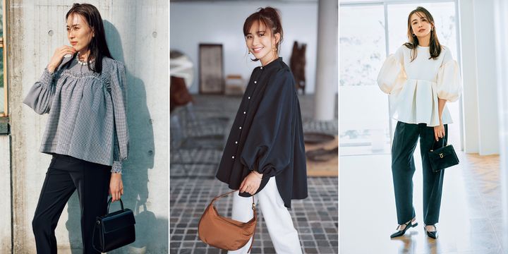 定番モノクロコーデも、ゆるっとしたシルエットの黒パンツで今っぽく更新。二の腕をすっぽり隠してくれるボリューム袖にペプラムデザインが華やかなので、アクセは最小限に抑えるのがベスト。バッグも小さめのものでバランスをとって。
