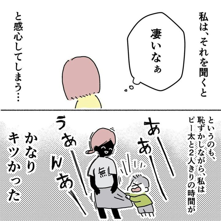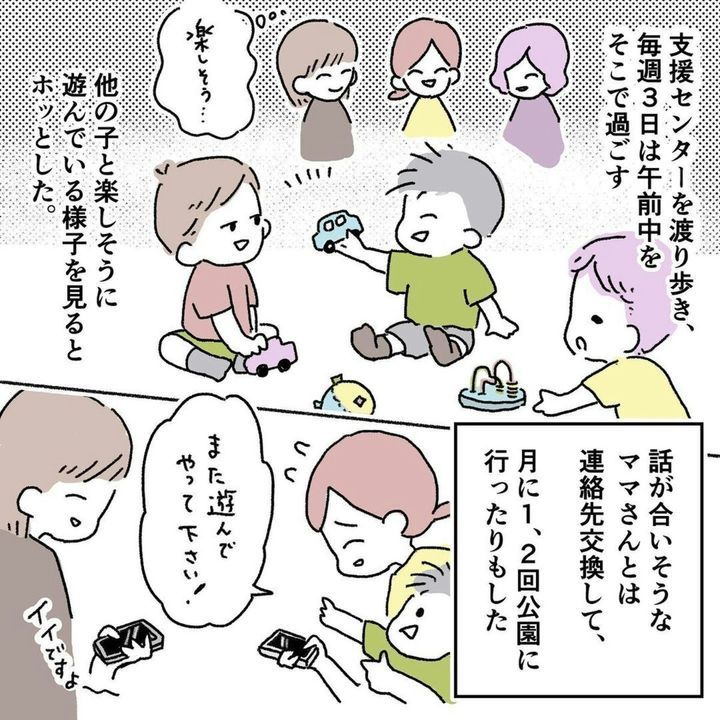ワンオペ育児で、息子と2人きりでいることがつらく感じていた河野りぬさんですが子育て支援センターで知り合ったママたちとの交流によって、子育てのつらさから救われたようです。