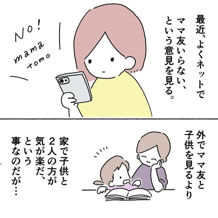 ワンオペ育児を辛く感じていた、河野りぬ@子育て&鬱経験エッセイ(@rinu.illustjob)さんは、インターネットの「ママ友はいらない」という書き込みに疑問を持ちます。というのも、河野りぬさんは子どもと1対1で家の中にいる方がしんどいと感じていたから…。ママ友と一緒に育児の時間を過ごせたことで救われたお話です。どうぞごらんください。