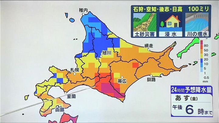 4日午後6時までの24時間に降る雨の量は、札幌周辺や道東方面などオレンジ色の地域で広く50ミリ前後のまとまった雨になります。
