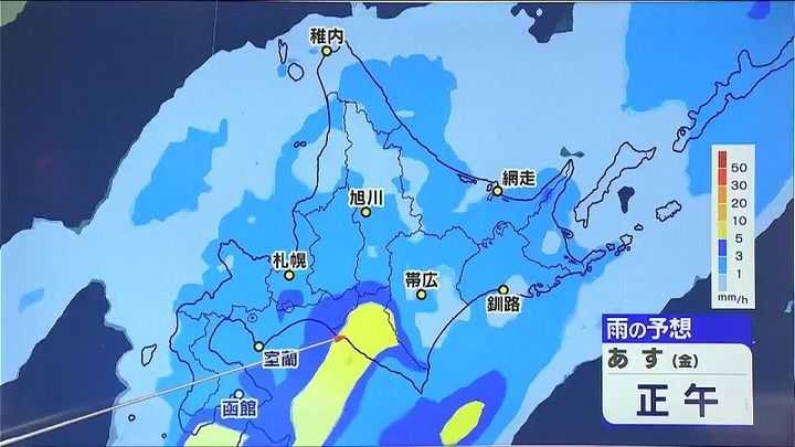 4日の日中は日高地方など太平洋側を中心に黄色やオレンジ色の表示。1時間に10~20ミリくらいと雨が強まります。