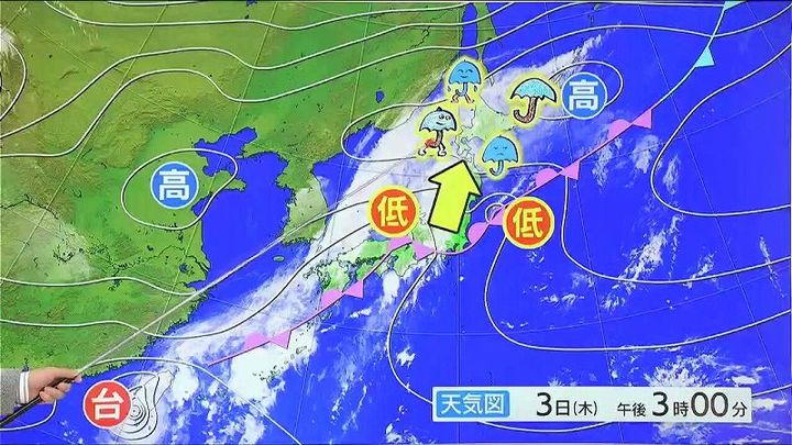 3日午後3時の雲と天気図を見ると、本州にある前線や低気圧から北に広がる雲が北海道にもかかっています。