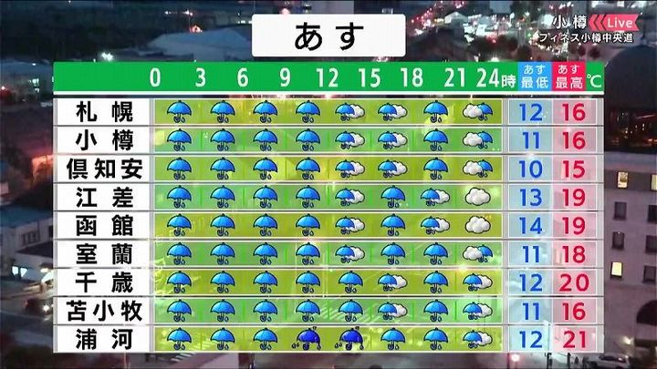 札幌や小樽、函館、室蘭などは昼頃を中心に雨が強まります。苫小牧や浦河方面は昼頃から夕方にかけてバケツをひっくり返したような激しい雨に注意してください。