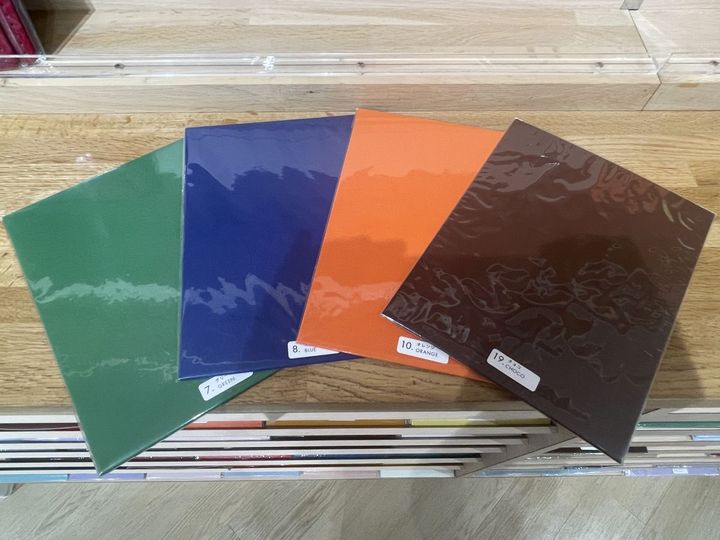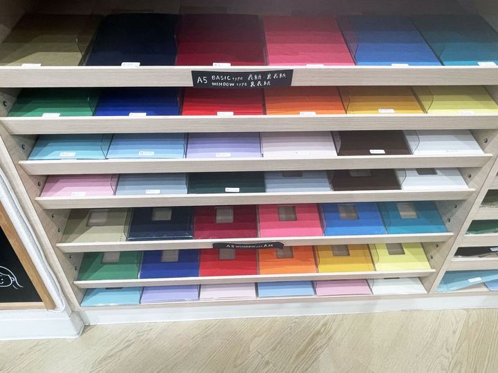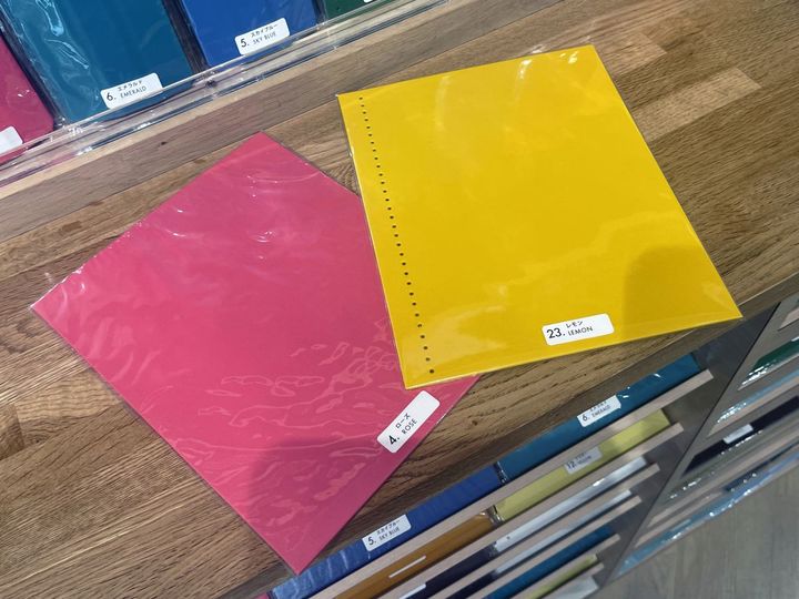 サイズと形(タイプ)が決まったら、表紙と裏表紙を決めます。棚にはカラフルなボードがずらり!A5サイズは24色のなかから好きな色を選んで作ることができるので、どの色を選ぶか迷ってしまいそう。B5サイズとA4サイズは14色のなかから選べます。