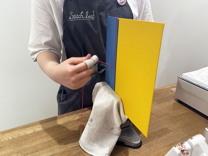 すばやく手縫いでバインダーを作り上げる様子はまさに職人技! 針を入れる角度や引っ張る強さを調整しながら、きれいなステッチになるように丁寧に仕上げていきます。