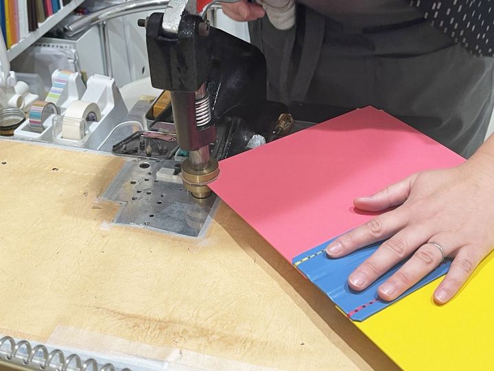 お店の奥ではスタッフが手作業でバインダーを作成している様子を見ることができます。今回は特別に注文したバインダーが仕上がる様子を見せていただきました。