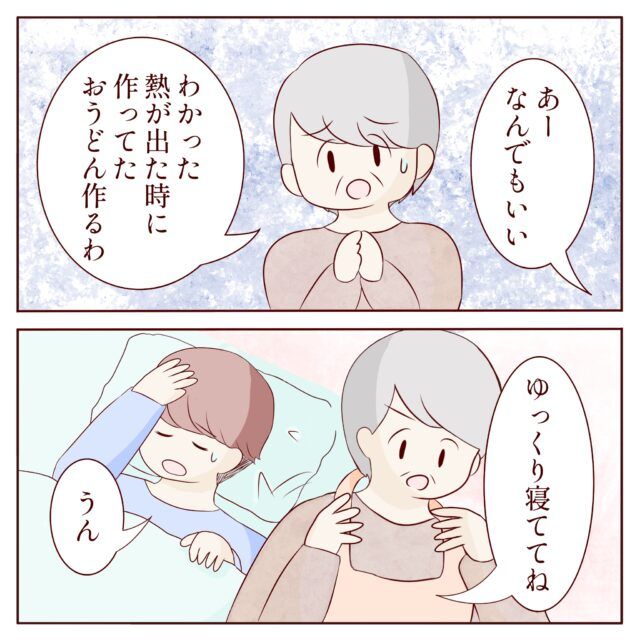 マサキさんがなんでもいいと言ったので、お義母さんは「わかった。熱が出た時に作ってたおうどん作るわ。ゆっくり寝ててね」と言い部屋を出て行きました。
