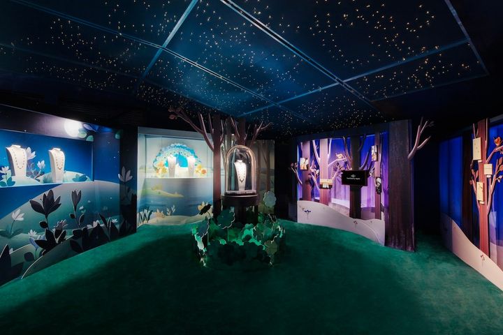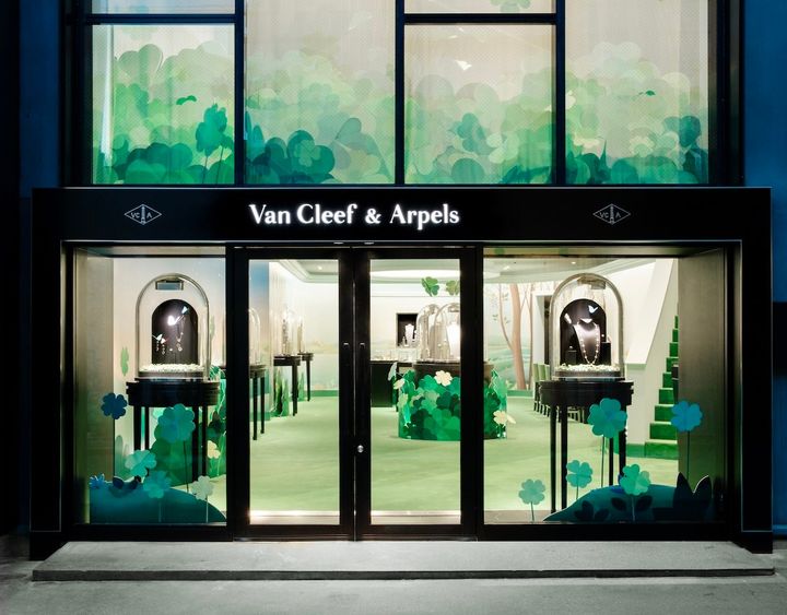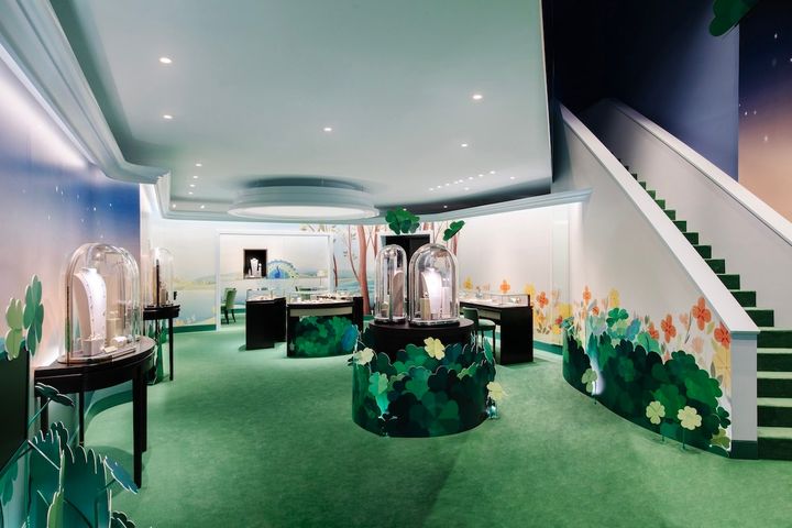 オープニングを飾るテーマは、メゾンの幸運のシンボル「アルハンブラ コレクション」だ。四つ葉のクローバーにインスパイアされた同コレクションは、1968年の誕生以来、メゾンが大切にするポジティブな人生観を象徴する存在。店内はフランス人とトルコ人のアーティストデュオ、ビュルキュ&ジョフレによる美しい装飾で彩られ、遊び心と幸せに満ちたコレクションの世界観を描き出す。