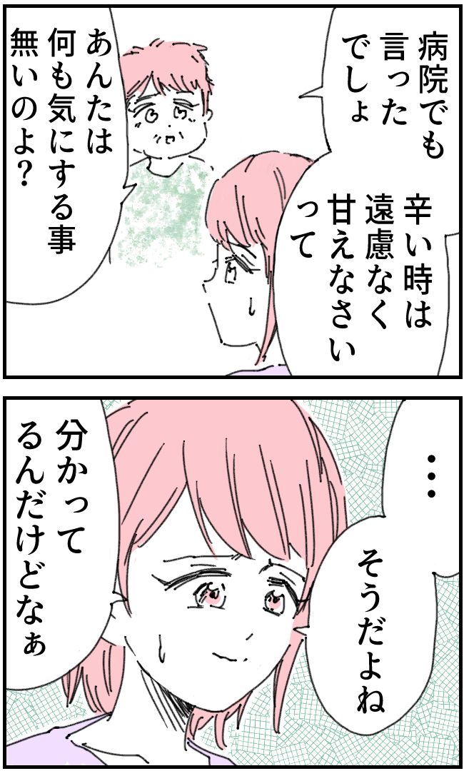 「病院でも言ったでしょ。辛い時は遠慮なく甘えなさいって。あんたは何も気にすることないのよ?」「・・・」お母さんにそう言われて無言になるかおりさん。「わかってるんだけどなぁ」と呟きました。