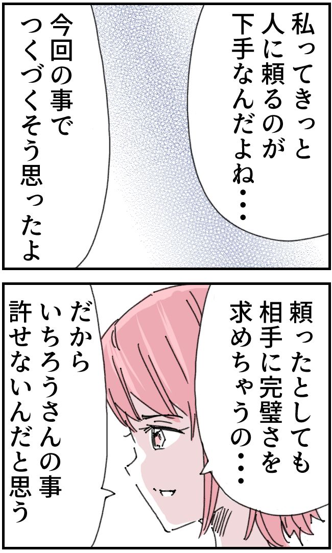 「私ってきっと人に頼るのが下手なんだよね・・。今回の事でつくづくそう思ったよ」「頼ったとしても相手に完璧さを求めちゃうの・・だから、いちろうさんの事許せないんだと思う」かおりさんが言葉を続けました。