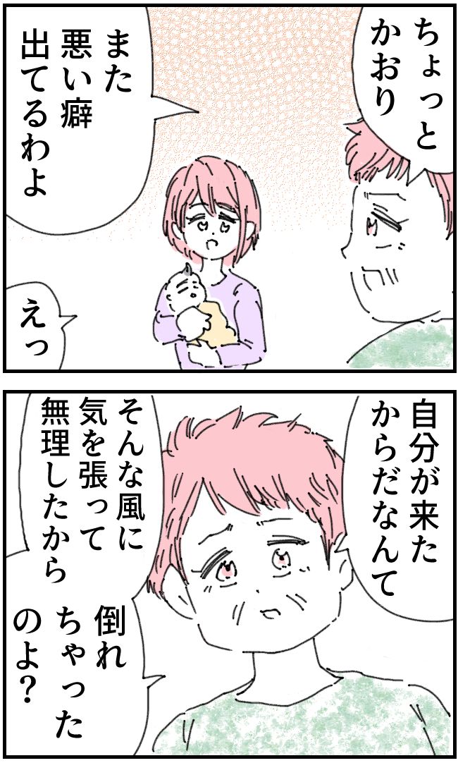 「ちょっとかおり、また悪いクセ出てるわよ」「えっ」お母さんに指摘されて驚くかおりさんに、「自分が来たからだなんて、そんな風に気を張って無理したから倒れちゃったのよ」お母さんは言いました。