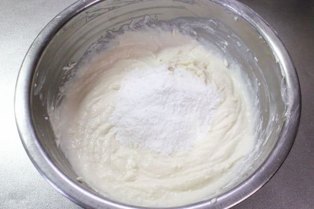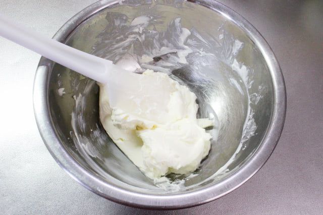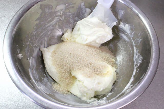 1. ボウルにクリームチーズを入れて、クリーム状になるまでシリコンベラで混ぜます。砂糖も加え、しっかりと混ぜ合わせます。