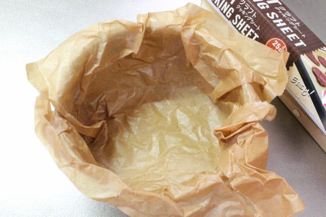 4. 約25cm四方に切ったクッキングシートを軽く揉み、シワを付けてから丸型に敷きます。生地を流し入れ、軽く台に打ち付けて空気を抜きます。