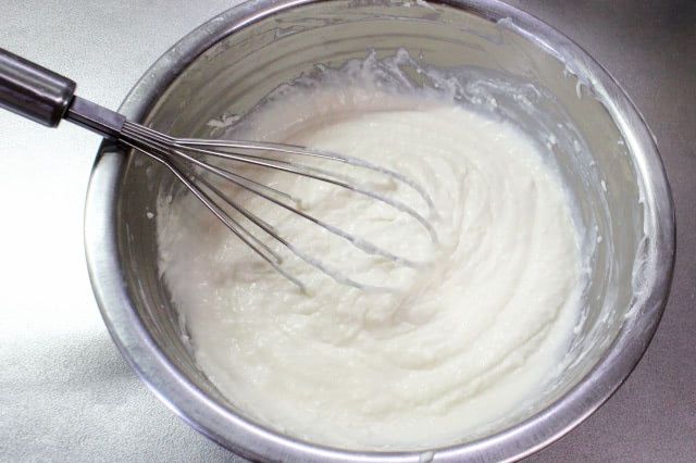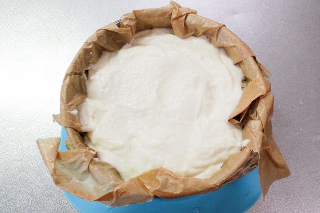 米粉は粘り気が出ないので、気にせずぐるぐると混ぜてくださいね。一般的なチーズケーキのように、卵や生クリームが入らないので、生地は流れるような緩さではなく、もったりした感じに仕上がりました。