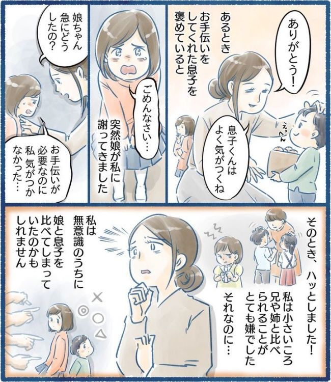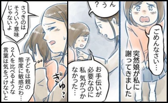 ある日、率先してお手伝いしてくれた息子を褒めていたら、娘が「ごめんなさい……」と言ってきたのです。なんのことかわからずにいたら娘が、「お手伝いが必要なのに気がつかなかった」と。そのとき、ハッとしました。