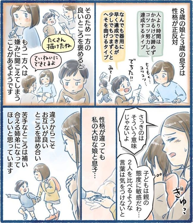 私には性格の違う姉と兄がいるのですが、小さいころ、比べられることがとても嫌でした。自分はそうしないようにしよう、と心に誓って子育てをしてきたつもりでした。ですが、同じおなかから生まれたのが不思議なくらい性格が正反対の子どもたちなので、無意識のうちに2人を比べていたのかもしれません。