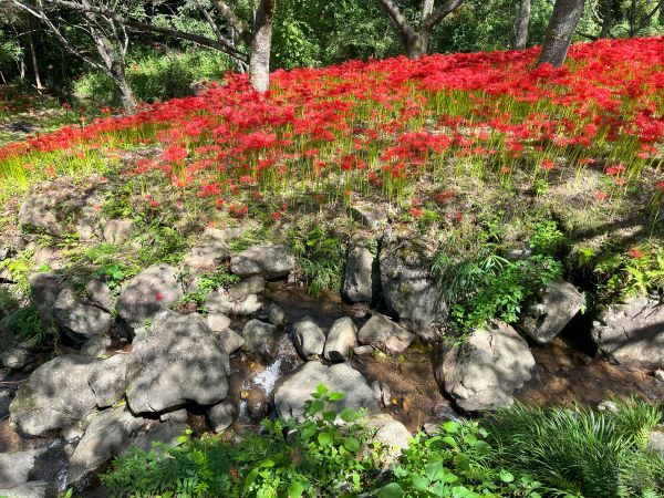 真っ赤な花の美しさだけでなく、川のせせらぎの音、里山の木々の香り、その木々に当たる柔らかい日の光、、、そんな自然の美しさを感じることができる場所です。