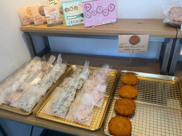 左から看板メニューの「ネッテ揚げ」 こちらは上質なすり身を揚げたシンプルな一品。お店のロゴが入っています。 次に「玉ねぎ天」「きくらげ天」「ねぎ天」「紅しょうが天」と並び、 一番右側には「分厚いがんす」がありました。
