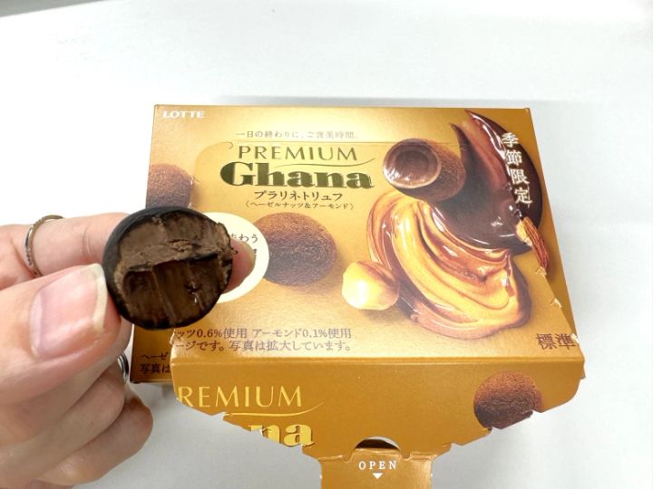 ロッテのガーナブランド担当者によると、プラリネトリュフのおすすめの食べ方は、噛まずに舌の上でゆっくりと溶かすこと。層になったミルクやアーモンド、ヘーゼルナッツそれぞれの濃厚な味わいをゆ~っくりと堪能することができるそうですよ♪