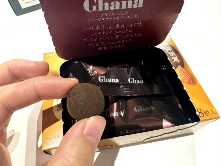 食べてみると、ナッツのコクやガーナの濃厚な味わいが口の中いっぱいに広がります。そしてやっぱりこのとろける食感がたまらない!コーヒーや紅茶、ワインなんかとペアリングしても絶対おいしいですよね♡