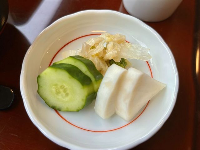 肝吸い・新香:最初に提供され、追加が必要な場合は希望者に追加分が提供されます。