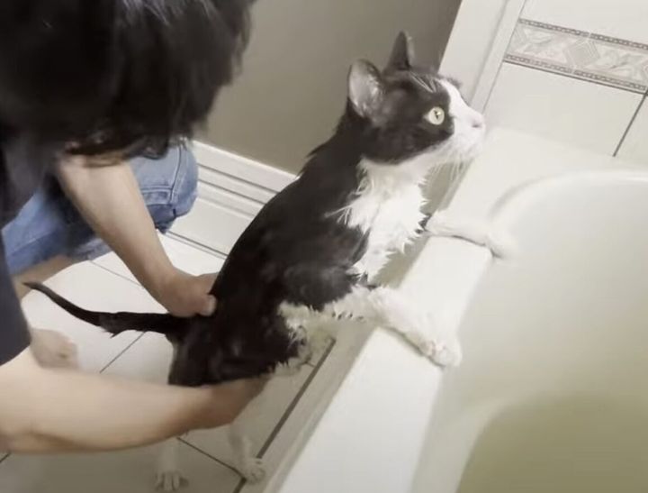 赤ちゃんみたいに、つかまり立ち! 素直に体を洗わせてくれる猫さん。