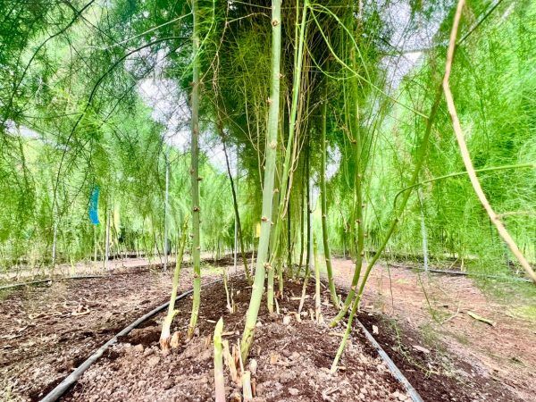 東京産のアスパラガスが地面から次々と顔をのぞかせています