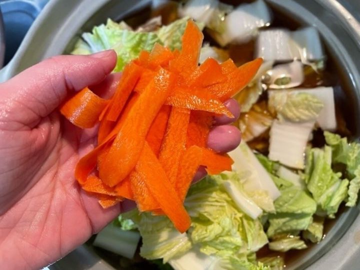 にんじんはピーラーで皮をむくようにして薄くしていきます。わが家では子どもは長ネギを食べないので、取り分けやすいように大きめの斜め切りにしました。