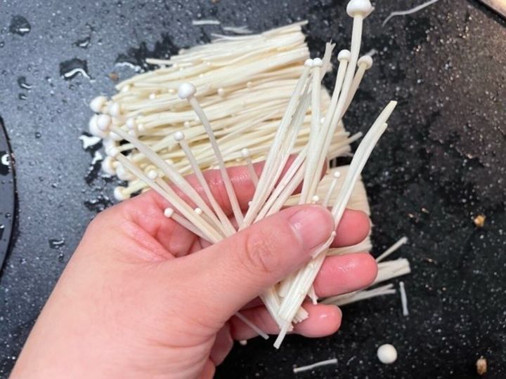 えのきは石づきを切り落とし、手でほぐします。しいたけも石づきを切り落とし、少し厚めに切ります。