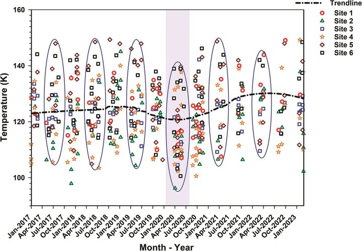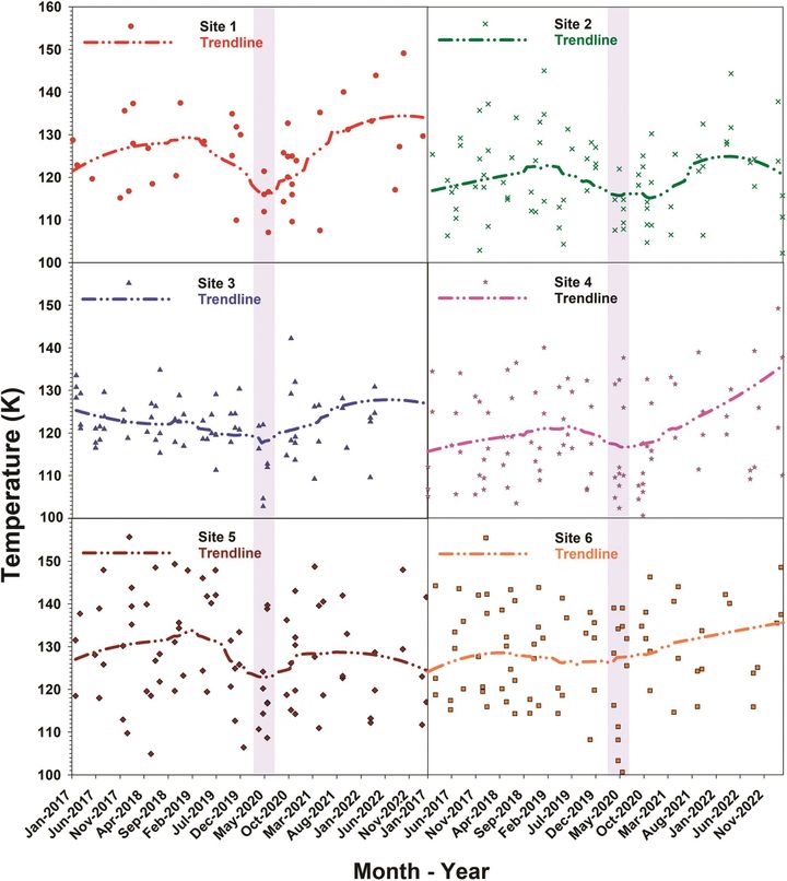 月面6カ所の温度変化をグラフにまとめたもの。2020年4月から温度が下がっていた / Credit: K Durga Prasad et al., Monthly Notices of the Royal Astronomical Society: Letters(2024)