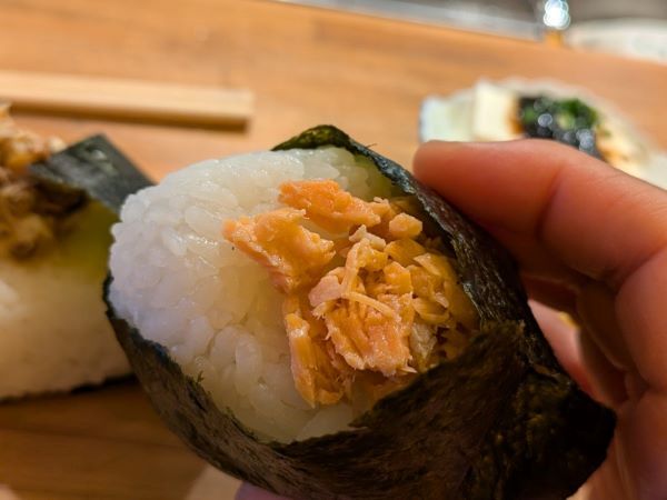 銀鮭は、オリジナルの下味をし、燻製パウダーで仕上げた香ばしさが、鼻腔を刺激して香りも最高のご馳走!鯖味噌は、大人気の「米ぬか味噌」で味付けした鯖なのですが、これがご飯に最高に合う味付けで、あっという間に大きめの2個のおむすびを完食しました。