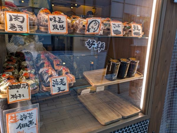 外から見えるテイクアウトのコーナーには、他の店舗と同じような、具がたっぷりの色鮮やかなおむすびが、ずらりと並んでいます。
